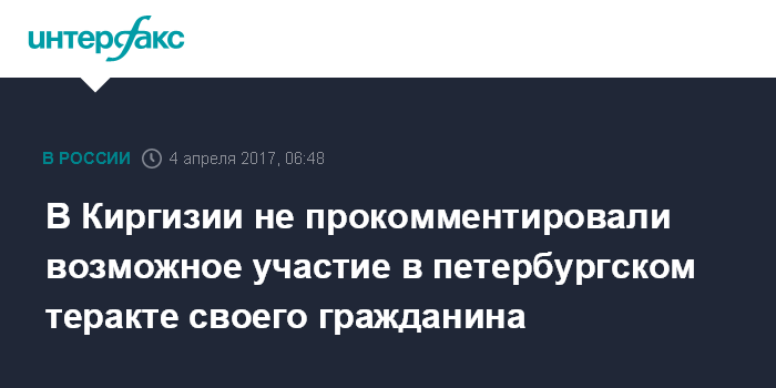 Москва. 4 апреля. INTERFAX.RU - Силовые структуры Киргизии пока не комментируют сообщения СМИ о том, что теракт в Петербурге якобы совершил уроженец республики.
