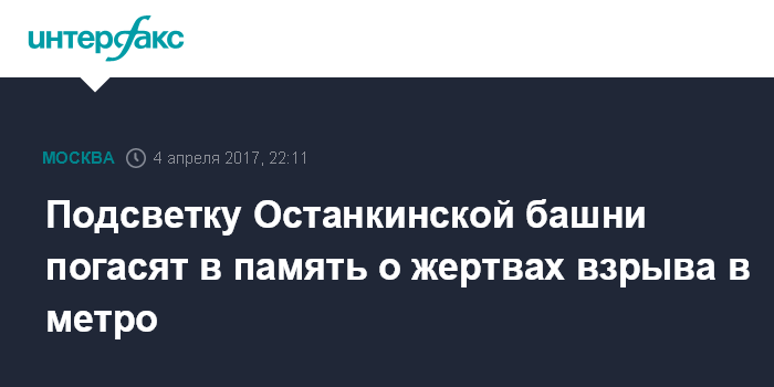 Москва. 4 апреля. INTERFAX.RU - Огни Останкинской башни погасят в память о погибших в теракте в Санкт-Петербурге, сообщили Российской телевизионной и радиовещательной сети.