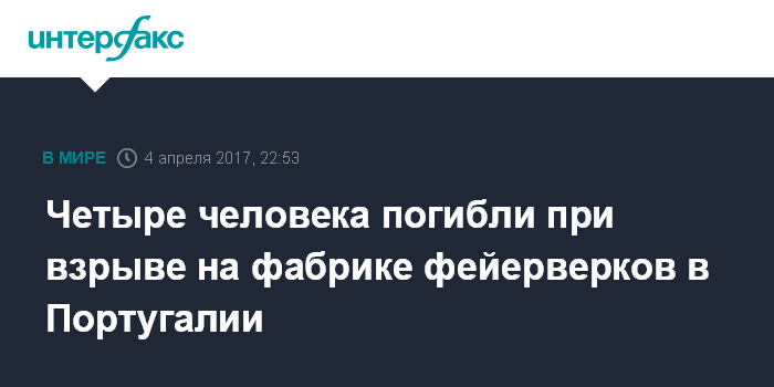 Москва. 4 апреля. INTERFAX.RU - По меньшей мере четыре человека стали жертвами мощного взрыва, который произошел на семейной фабрике фейерверков на севере Португалии, сообщает во вторник агентство Associated Press со ссылкой на местные экстренные службы.