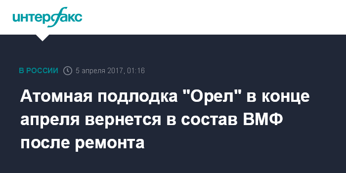 Москва. 5 апреля. INTERFAX.RU - В рамках выполнения плана военного судоремонта многоцелевая атомная подводная лодка "Орёл" вернется в состав Подводных сил ВМФ до конца апреля 2017 года, сообщил в среду представитель Департамента информации и массовых коммуникаций Министерства обороны РФ по Военно-Морскому Флоту капитан первого ранга Игорь Дыгало.