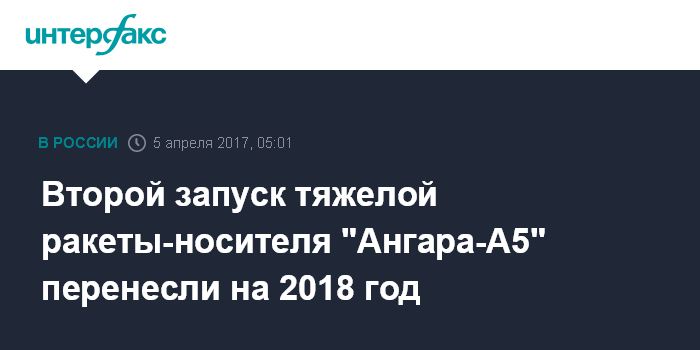 "Мы перенесли его (пуск ракеты "Ангара-А5" - ИФ) на 2018 год. Причина банальна: параллельно с опытно-конструкторскими работами у нас шел процесс передачи производства в Омск, и мы по обоюдному согласию с Минобороны РФ решили провести дополнительные испытания", - сказал он. Ранее запуск был намечен на 2017 год.
