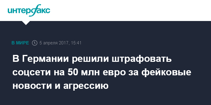 Москва. 5 апреля. INTERFAX.RU - Правительство Германии в среду поддержало законопроект о введении штрафов на сумму до 50 млн евро для социальных сетей, если те не дадут пользователям жаловаться на разжигающие ненависть сообщения и фейковые новости или откажутся удалять такой контент.