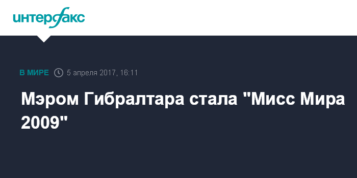 Москва. 5 апреля. INTERFAX.RU - Обладательница титула "Мисс Мира 2009" Кайане Лопес стала мэром Гибралтара - формальным представителем этой заморской территории Великобритании, сообщает в среду издание The Daily Telegraph.