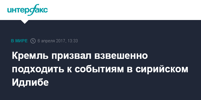 Москва. 6 апреля. INTERFAX.RU - В Кремле призывают к взвешенной оценке инцидента в сирийском Идлибе и предлагают не делать скоропалительных выводов, заявил пресс-секретарь президента РФ Дмитрий Песков.