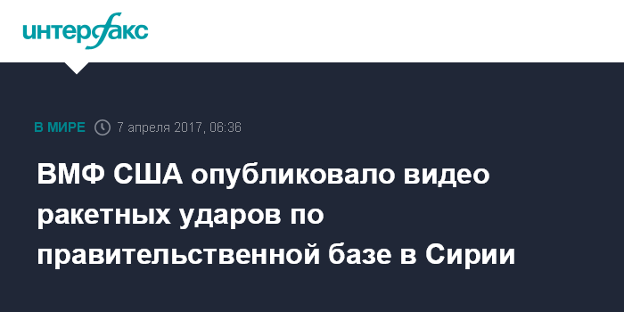 Москва. 7 апреля. INTERFAX.RU - Военно-морские силы США опубликовали видео пусков крылатых ракет "Томагавк", осуществленных в четверг с американских кораблей в Средиземном море по целям на аэродроме Шайрат в сирийском Хомсе, где базировались военные сирийской правительственной армии.