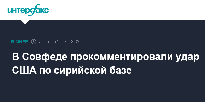 Москва. 7 апреля. INTERFAX.RU - Удар США по сирийской авиабазе является актом агрессии против независимого государства, заявил глава комитета Совета Федерации по обороне и безопасности Виктор Озеров.