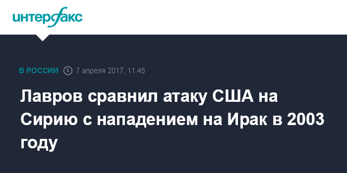 Москва. 7 апреля. INTERFAX.RU - Министр иностранных дел РФ Сергей Лавров сравнил атаку США на Сирию с нападением Запада на Ирак 14 лет назад.