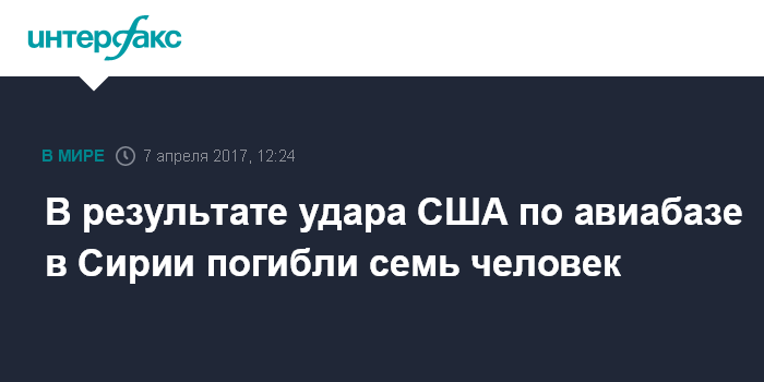 Москва. 7 апреля. INTERFAX.RU - Семь человек погибли, столько же получили ранения в результате ракетного удара армии США, сообщил корреспондент телеканала "Россия 24" (ВГТРК) в прямом эфире.