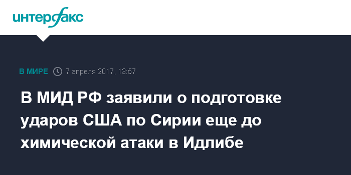 Москва. 7 апреля. INTERFAX.RU - МИД РФ полагает, что применение американцами крылатых ракет по Сирии готовилось заранее, и события 4 апреля - предполагаемая химическая атака в провинции Идлиб - послужили лишь поводом для его осуществления.