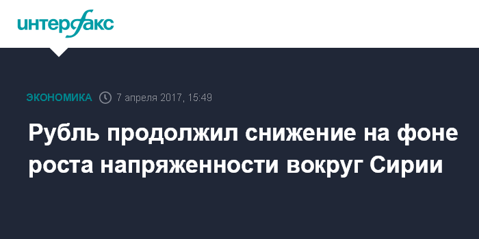 По мнению экспертов "Интерфакс-ЦЭА", рубль падает к доллару и евро днем в пятницу на фоне роста геополитической напряженности в связи с ракетными ударами США по авиабазе в Сирии и усиления неопределенности в отношении дальнейшего взаимодействия России и США в решении сирийской проблемы. Нефть несколько сократила рост, однако продолжает торговаться в "зеленой зоне" на новости о ракетных ударах. Стоимость июньских фьючерсов на нефть Brent на лондонской бирже ICE Futures к 15:00 МСК поднялась на 0,53% - до $55,18 за баррель. Цена фьючерса на нефть WTI на май на электронных торгах Нью-йоркской товарной биржи (NYMEX) увеличилась к этому времени на 0,74% - до $52,16 за баррель. Как сообщалось, США в ночь на пятницу нанесли удар по военной базе на западе Сирии в ответ на химическую атаку в Идлибе. По данным американских властей, около 60 "Томагавков" были выпущены с военных кораблей в Средиземном море по аэродрому в провинции Хомс.