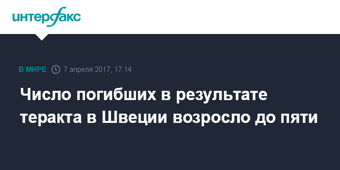 Москва. 7 апреля. INTERFAX.RU - До пяти возросло число жертв теракта в центре Стокгольма, сообщила в пятницу радиостанция Ekot. Ранее премьер-министр страны подтвердил гибель двух человек.