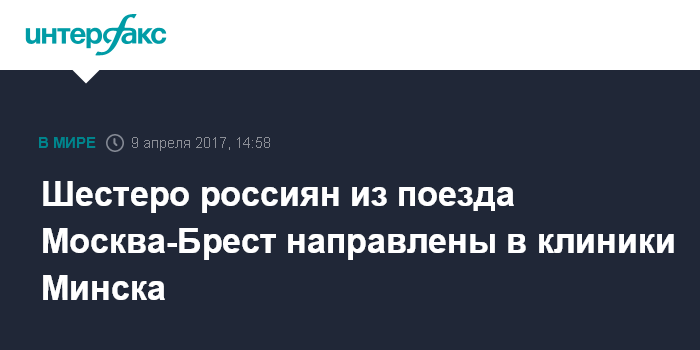 Москва. 9 апреля. INTERFAX.RU - Шестеро пострадавших пассажиров поезда Москва-Брест, который прибыл почти с шестичасовым опозданием в Минск, направлены в клиники белорусской столицы, все - граждане России, сообщают госСМИ со ссылкой на исполняющего обязанности председателя Комитета по здравоохранению Мингорисполкома Дмитрия Чередниченко.