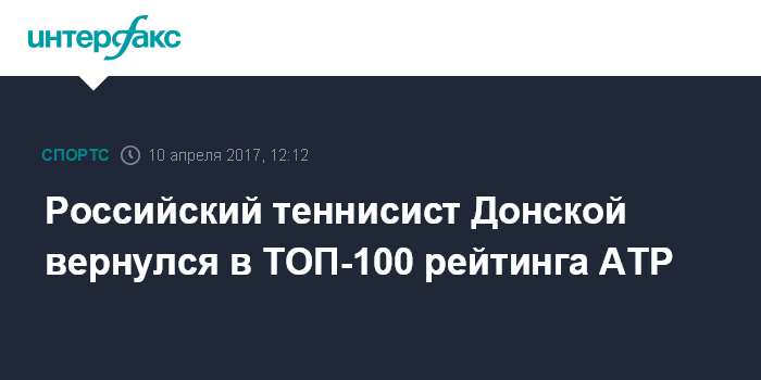 Москва. 10 апреля. INTERFAX.RU - Россиянин Евгений Донской поднялся на 99-е место в рейтинге Ассоциации теннисистов-профессионалов (ATP), обновленная версия которого опубликована в понедельник.