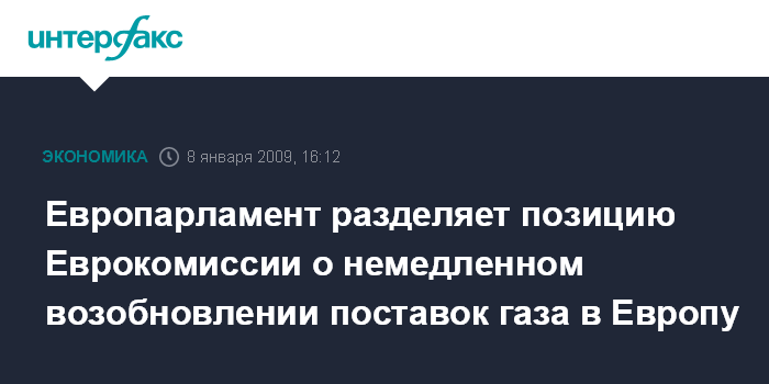 Брюссель. 8 января. INTERFAX.RU - Европейский парламент целиком и полностью разделяет позицию Европейской комиссии о немедленном возобновлении поставок российского газа в страны Евросоюза. В свою очередь Украина гарантирует выполнение обязательств как надежного партнера-транзитера газа.