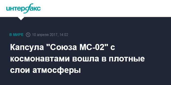Москва. 10 апреля. INTERFAX.RU - Спускаемая капсула космического корабля "Союз МС-02" вошла в плотные слои земной атмосферы, сообщили "Интерфаксу" в Центре управления полетами (ЦУП).