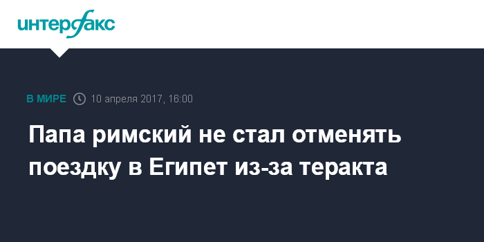 Москва. 10 апреля. INTERFAX.RU - Папа римский Франциск не собирается из-за терактов отменять свой визит в Египет, намеченный на конец апреля, сообщает в понедельник газета Corriere della Sera со ссылкой на Ватикан.