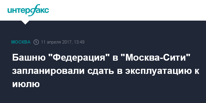 Москва. 11 апреля. INTERFAX.RU - Окончание строительства и пусконаладочных работ в башне "Федерация" в Московском международном деловом центре "Москва-Сити" намечено на конец июня - начало июля. Об этом сообщил журналистам во вторник начальник управления по надзору за уникальными зданиями и сооружениями Мосгосстройнадзора Алексей Курбатов.