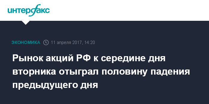 Москва. 11 апреля. INTERFAX.RU - Рынок акций РФ к середине дня вторника отыграл около половины падения предыдущего дня в ожидании встречи главы МИД РФ Сергея Лаврова с главой Госдепартамента США Рексом Тиллерсоном, где в центре внимания будет ситуация вокруг Сирии; индекс РТС при этом вернулся к отметке 1100 пунктов.