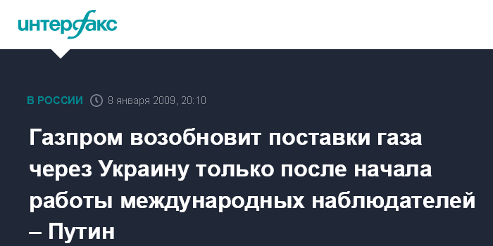 Газпром возобновит поставки газа через Украину только после начала работы международных наблюдателей – Путин