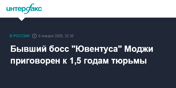 Лондон. 8 января. ИНТЕРФАКС - Бывший генеральный директор итальянского футбольного клуба "Ювентус" Лючано Моджи приговорен к полутора годам тюремного заключения после того, как его признали виновным в коррупции, сообщает в четверг британская телерадиокорпорация Би-Би-Си.