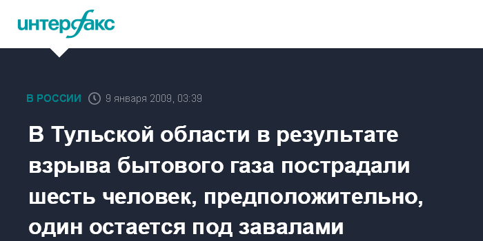 Тула. 9 января. ИНТЕРФАКС-ЦЕНТР - В городе Донской (Тульская область) в результате взрыва бытового газа в жилом доме пострадали шесть человек, один остается под завалами, сообщили "Интерфаксу" в пресс-службе центрального регионального центра МЧС.