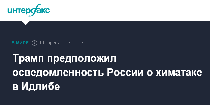 Москва. 13 апреля. INTERFAX.RU - Президент США Дональд Трамп считает возможным, хотя и маловероятным то, что Россия заранее знала о химатаке в Сирии.