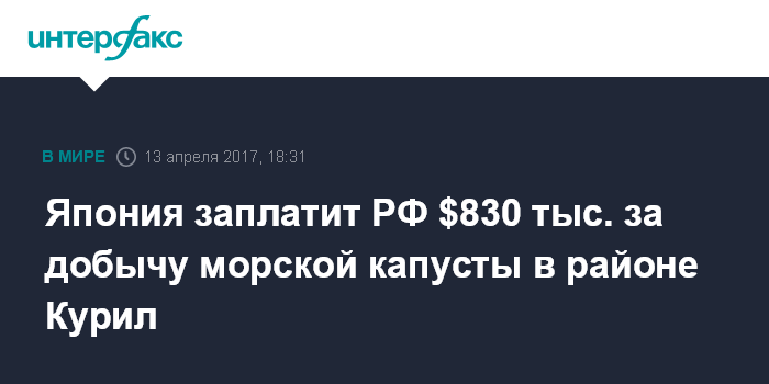 Москва. 13 апреля. INTERFAX.RU - Япония в этом году заплатит РФ 90,5 млн йен (около $830 тыс.) за право добычи морской капусты (ламинарии) в районе Курил. Как сообщает Росрыболовство, объем промысла не должен превышать 3 892 тонны.