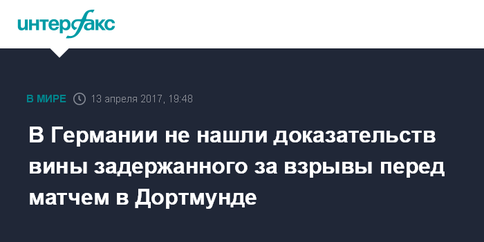 Москва. 13 апреля. INTERFAX.RU - В прокуратуре Германии не нашли убедительных доказательств того, что ранее задержанный выходец из Ирака имеет отношение к взрывам у автобуса дортмундской футбольной команды "Боруссия", говоритсяв распространенном в четверг заявлении ведомства.