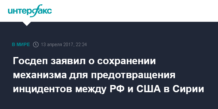 Москва. 13 апреля. INTERFAX.RU - Российско-американский механизм по предотвращению инцидентов в небе Сирии действует, заявил в четверг официальный представитель госдепартамента Марк Тонер.