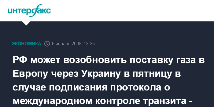 "Мы рассчитываем, что в течение сегодняшнего дня будет подписан протокол о создании международного независимого механизма об обеспечении транзита российского газа через территорию Украины, и буквально сразу возобновим поставки", - сказал А.Миллер.