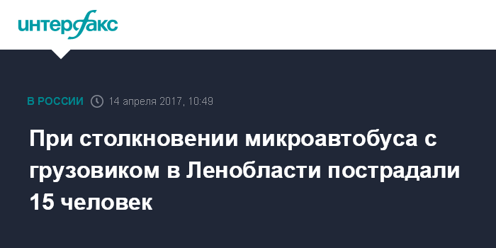 Москва. 14 апреля. INTERFAX.RU - В результате столкновения автобуса с грузовиком в Ленинградской области пострадали 15 человек, сообщила пресс-служба УГИБДД региона в пятницу.
