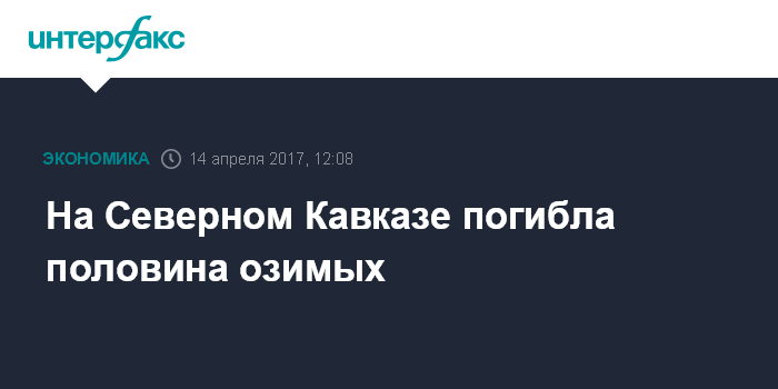 "В Ставропольском крае озимые крайне неудовлетворительно перезимовали на 783,1 тыс. га, на 943,5 тыс. га посевы погибли почти на половине площадей", - говорится в сообщении. При этом в министерстве сельского хозяйства Ставрополья "Интерфаксу" заявили, что эта информация не соответствует действительности и озимые хорошо перенесли зиму.