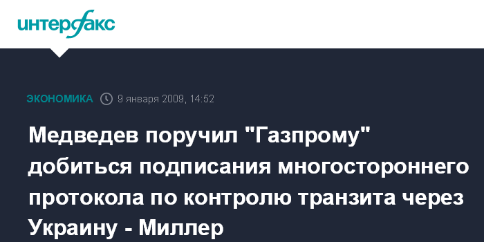 Сочи. 9 января. INTERFAX.RU - Президент России Дмитрий Медведев получил руководству "Газпрома" в кратчайшие сроки добиться подписания многостороннего протокола по созданию международной комиссии по мониторингу транзита газа через территорию Украины, заявил журналистам председатель правления "Газпрома" Алексей Миллер.