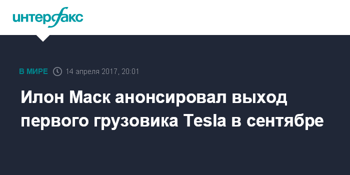 Москва. 14 апреля. INTERFAX.RU - Американский автопроизводитель Tesla Inc. планирует представить свой первый грузовой автомобиль с электрическим двигателем в сентябре 2017 года.