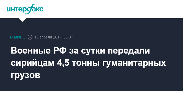 Москва. 15 апреля. INTERFAX.RU - Российский центр по примирению враждующих сторон в Сирии за сутки провел шесть гуманитарных акций в провинции Алеппо, а также по одной гуманитарной акции в Дамаске и Латакии.