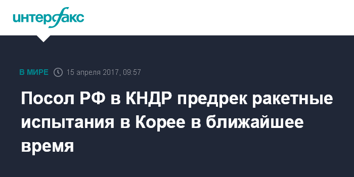 Москва. 15 апреля. INTERFAX.RU - В России видят высокую вероятность того, что КНДР вскоре проведет новое ракетное испытание и постарается приурочить его к государственному празднику Дню Солнца, который отмечается 15 апреля, заявил посол РФ в Пхеньяне Александр Мацегора.