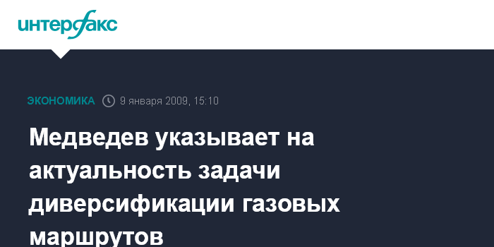Сочи. 9 января. INTERFAX.RU - Диверсификации газовых маршрутов, несмотря на мировой финансовый кризис, остается для России актуальной, заявил президент России Дмитрий Медведев на встрече с главой "Газпрома" Алексеем Миллером.