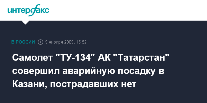 Казань. 9 января. INTERFAX.RU - В международном аэропорту "Казань" утром в пятницу из-за неполадок в шасси совершил аварийную посадку самолет "Ту-134" авиакомпании "Татарстан".