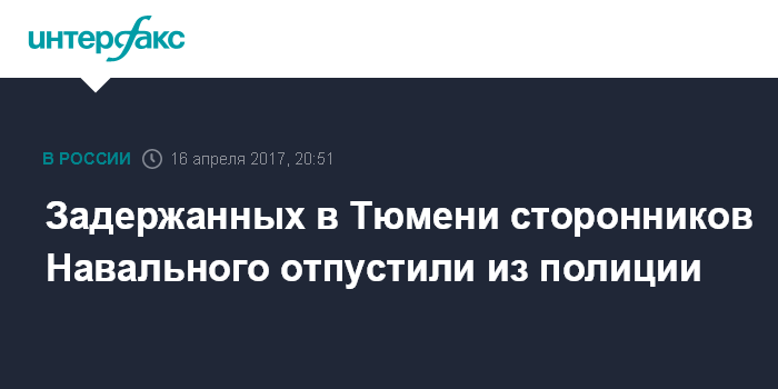 Москва. 16 апреля. INTERFAX.RU - Четверых членов штаба оппозиционера Алексея Навального, задержанных днем в воскресенье в Тюмени во время проведения агитационной акции, отпустили из отдела полиции.