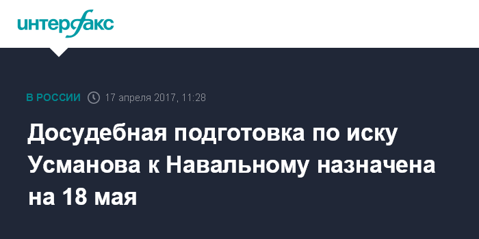 Москва. 17 апреля. INTERFAX.RU - Люблинский суд Москвы 18 мая проведет подготовку по иску о защите чести и достоинства бизнесмена Алишера Усманова к оппозиционному политику Алексею Навальному и основанному им Фонду борьбы с коррупцией. Об этом сообщила "Интерфаксу" пресс-секретарь суда Людмила Морозова.