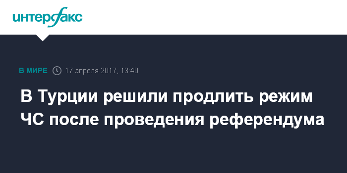 Москва. 17 апреля. INTERFAX.RU - Турция намерена продлить длящийся почти девять месяцев режим чрезвычайной ситуации после проведения в стране референдума о поправках к конституции, сообщает в понедельник телеканал NTV.