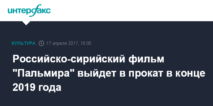 Москва. 17 апреля. INTERFAX.RU - Первый российско-сирийский фильм "Пальмира" выйдет в прокат в конце 2019 года, сообщили создатели ленты на подписании соглашения между российской компанией "Пролайн-медиа" и сирийской Shaghaf в министерстве культуры РФ.