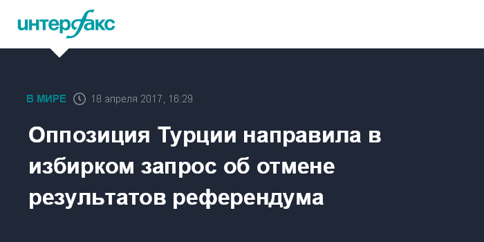 Москва. 18 апреля. INTERFAX.RU - Оппозиционная турецкая Республиканская народная партия (РНП) направила в Высший избирательный совет (ВИС) Турции официальный запрос с требованием отменить результаты недавнего референдума из-за нарушений в ходе голосования, сообщает во вторник агентство AP.