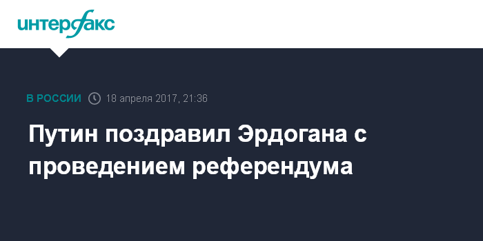 "Владимир Путин поздравил Реджепа Тайипа Эрдогана с успешным проведением референдума по внесению изменений в Конституцию Турции", - говорится в сообщении.