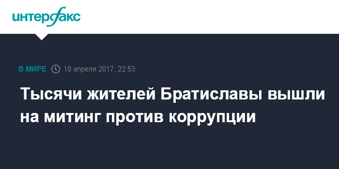 Москва. 18 апреля. INTERFAX.RU - Несколько тысяч человек вышли на улицы в столице Словакии Братиславе в знак протеста против коррупции в стране, сообщают во вторник западные СМИ.