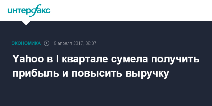 Москва. 19 апреля. INTERFAX.RU - Интернет-компания Yahoo, находящаяся в процессе продажи своих интернет-активов оператору связи Verizon Communucations, вышла на прибыльный уровень в первом квартале 2017 года и повысила выручку. Как говорится в пресс-релизе компании, она получила чистую прибыль в размере $99 млн против аналогичного убытка за тот же квартал прошлого года. Выручка составила $1,33 млрд по сравнению с $1,1 млрд.
