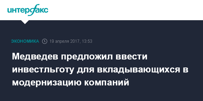 Москва. 19 апреля. INTERFAX.RU - Правительство предлагает ввести инвестиционную льготу по налогу на прибыль в размере до 5% при инвестировании предприятиями средств в свою модернизацию, сообщил премьер-министр Дмитрий Медведев в Госдуме, говоря о системных мерах поддержки предприятий.