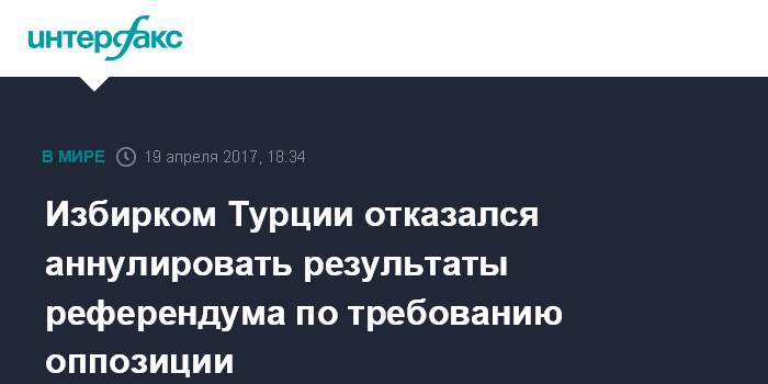 Ранее сообщалось, что представители турецкой оппозиции потребовали аннулировать результаты референдума из-за нарушений в ходе голосования. Часть конвертов и бюллетеней, использованных в ходе референдума, оказалась без печатей, но Высший избирательный совет Турции принял решение засчитать эти бюллетени