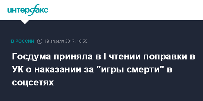 Москва. 19 апреля. INTERFAX.RU - Госдума на заседании в среду приняла в первом чтении поправки в Уголовный кодекс (УК) РФ, предусматривающие наказание за организацию "игр смерти" для детей в виде лишения свободы до трех лет, а также наказание в виде лишения свободы до семи лет за склонение несовершеннолетних к самоубийству, в том числе, через "группы смерти" в соцсетях.