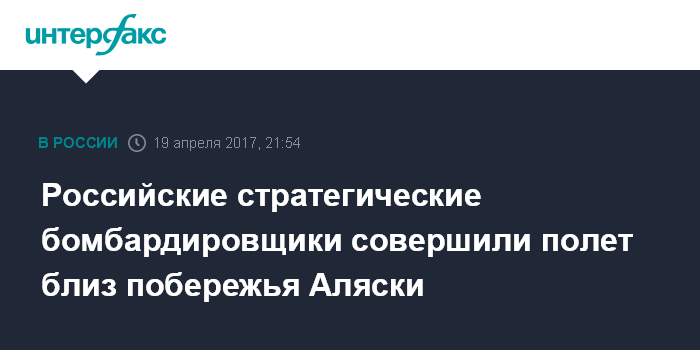 По их данным, российские дальние бомбардировщики осуществляли полет в понедельник вечером по местному времени на Аляске в 160 км от острова Кадьяк. Навстречу самолетам ВКС были направлены истребители ВВС США F-22 и самолет дальнего радиолокационного обнаружения и управления авиацией Е-3 с авиабазы Элмендорф-Ричардсон под Анкориджем.